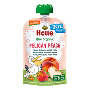 Holle Organic Food Pouch Pelican Peach contains pure demeter (highest organic quality) and organic certified peach, strawberry, apple and oats with absolutely no additives. Unsweetened*, they contain less sugar than comparable pouches on the market, thanks to Holle's carefully selected and pure recipes. In a convenient and resealable pouch for practical, mess-free portion feeding at home or on the go, Pelican Peach is perfect as part of a filling breakfast, as an energy boosting snack or as a simple pudding.