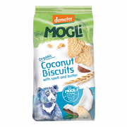 MOGLi Coconut Biscuits are a treat! Finest organic spelt and wheat flour from demeter certified grains, creamy demeter butter, organic coconut, gently sweetened with mild organic agave syrup - just the ingredients you would use in your kitchen to bake for your family. Kids from the MOGLi children's panel have approved the taste and can't get enough of this snack.