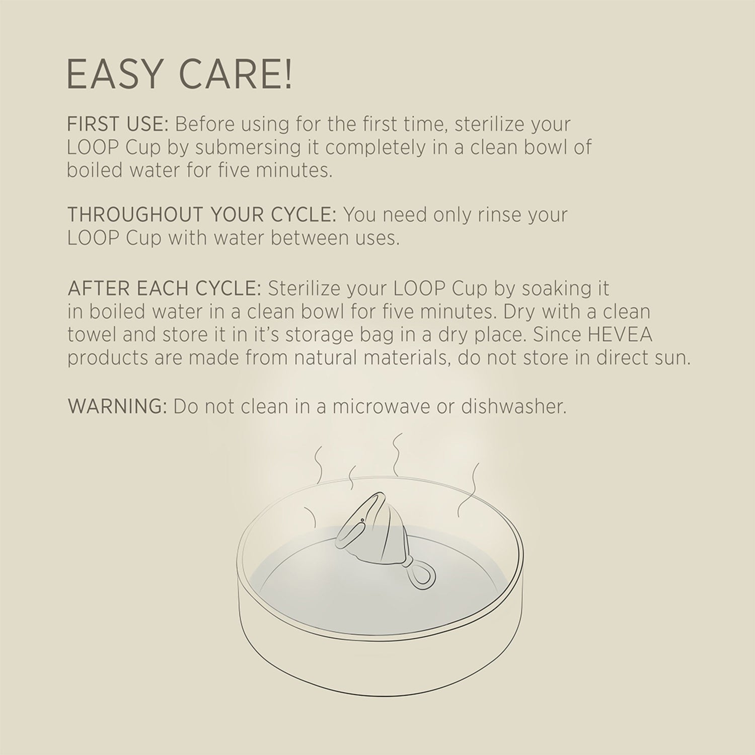 - AFTER EACH CYCLE: Sterilize your LOOP Cup by soaking it in boiled water in a clean bowl for five minutes. Dry with a clean towel and store it in it’s storage bag in a dry place. Since HEVEA products are made from natural materials, do not store in direct sun.
