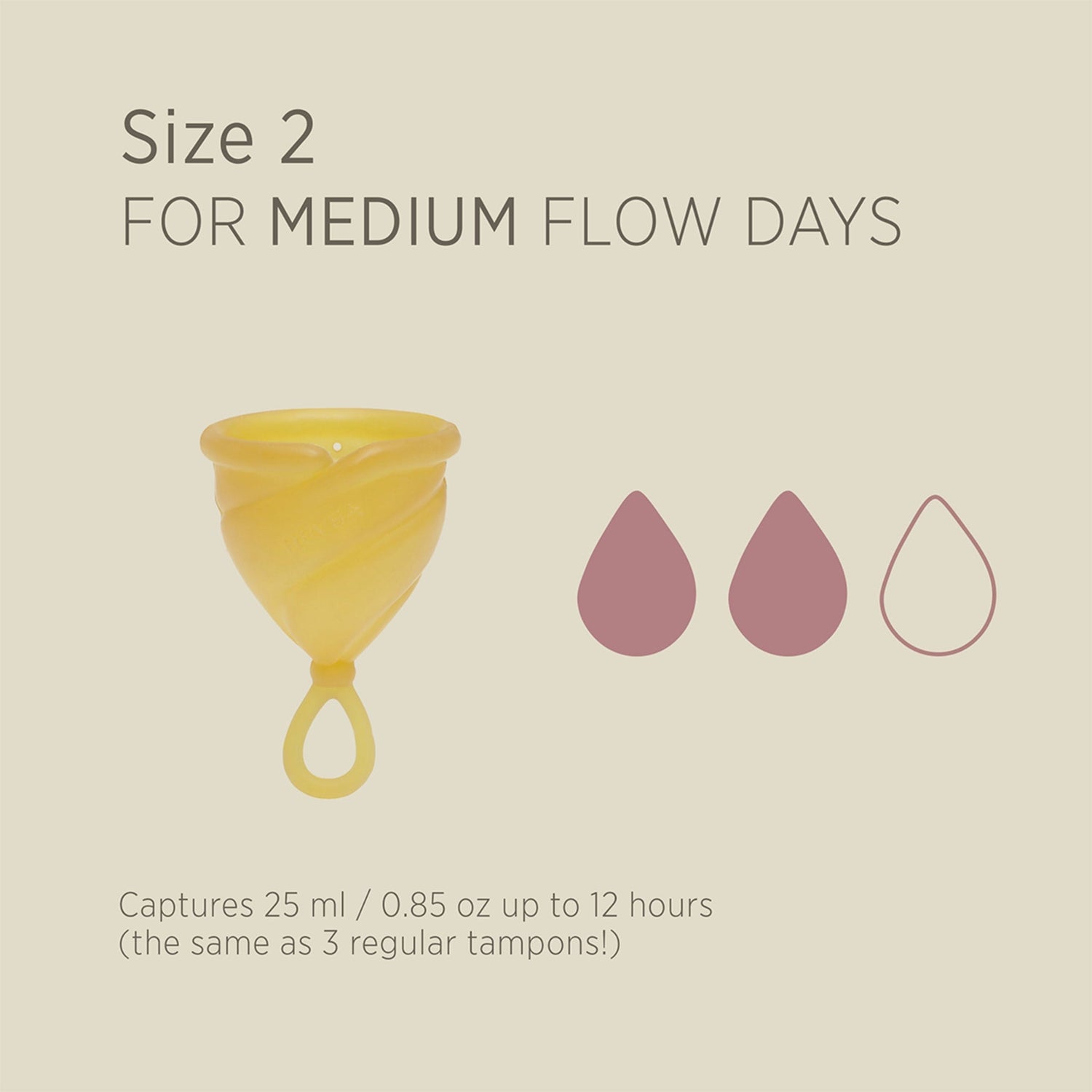 - Recommended for your MEDIUM flow days - Our Size 2 Cup can capture 25 ml/0.85 oz up to 12 hours (the same as 3 regular tampons!)