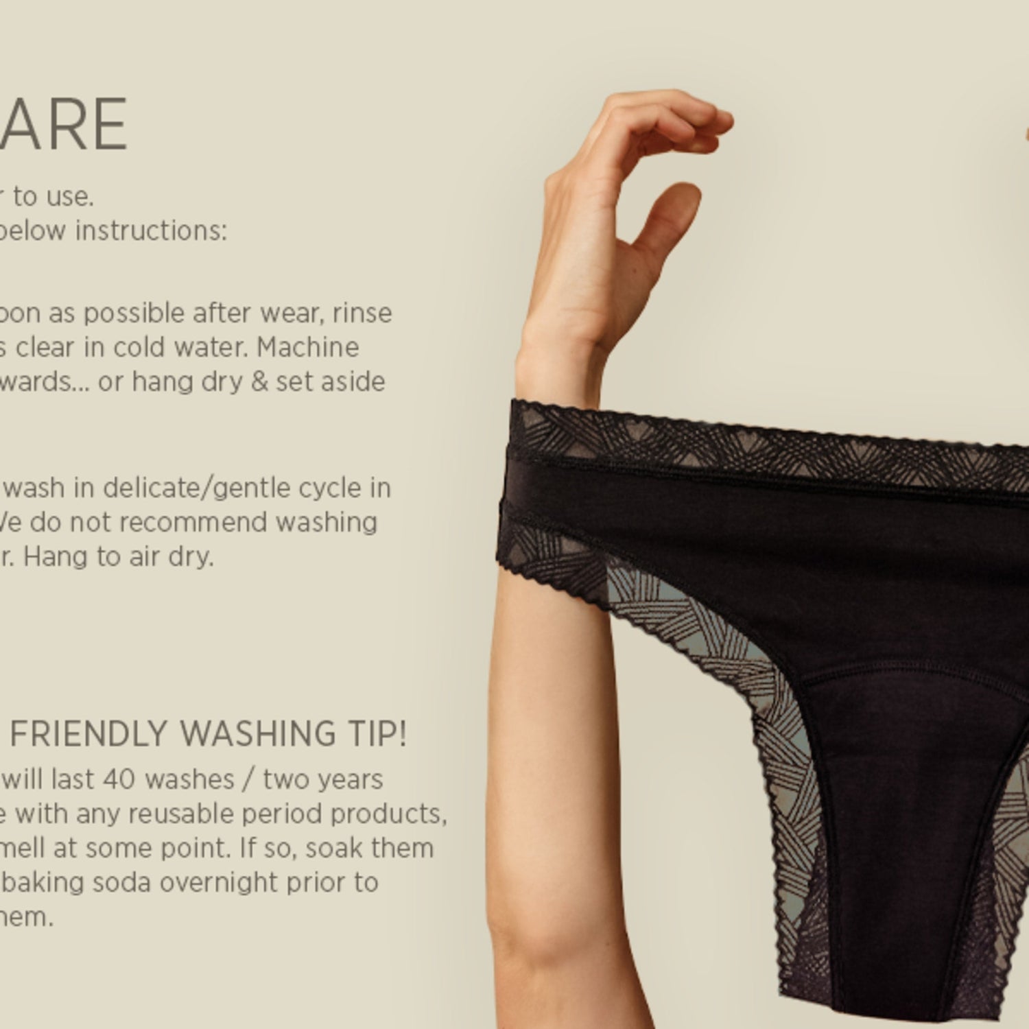 ECO FRIENDLY TIP: Our Period Panties will last 40 washes/two years on average, and like with any reusable period products, they may start to smell at some point. If so, soak them in white vinegar or baking soda overnight prior to machine washing them.