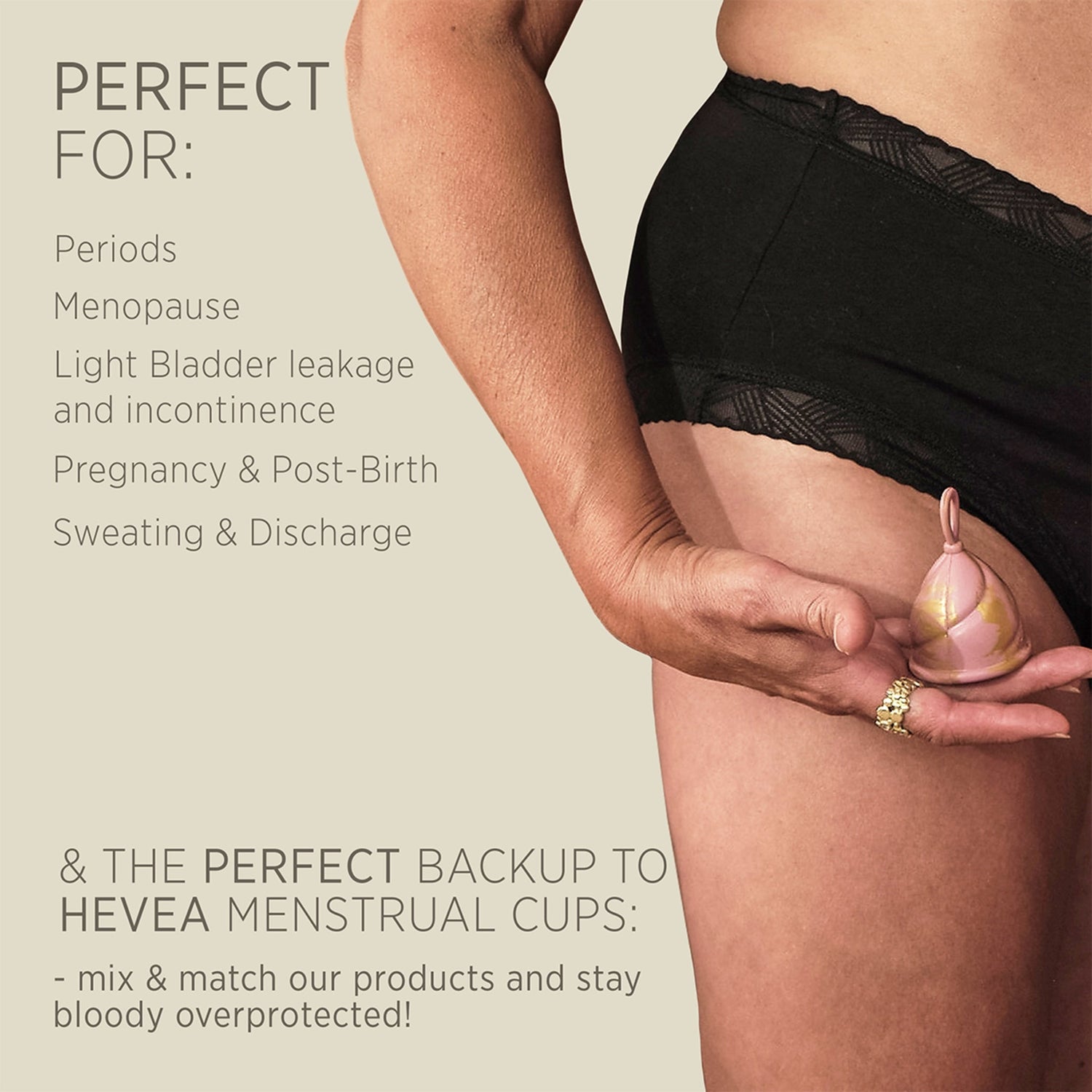 Our range of new period panties and menstrual cups can be mixed and matched depending on period flow and daily lifestyle needs, as well as for incontinence, menopause, pregnancy or afterbirth discharge. Therefore, eliminating the need for single-use period products that come at both a high cost for both the consumer and for the planet.