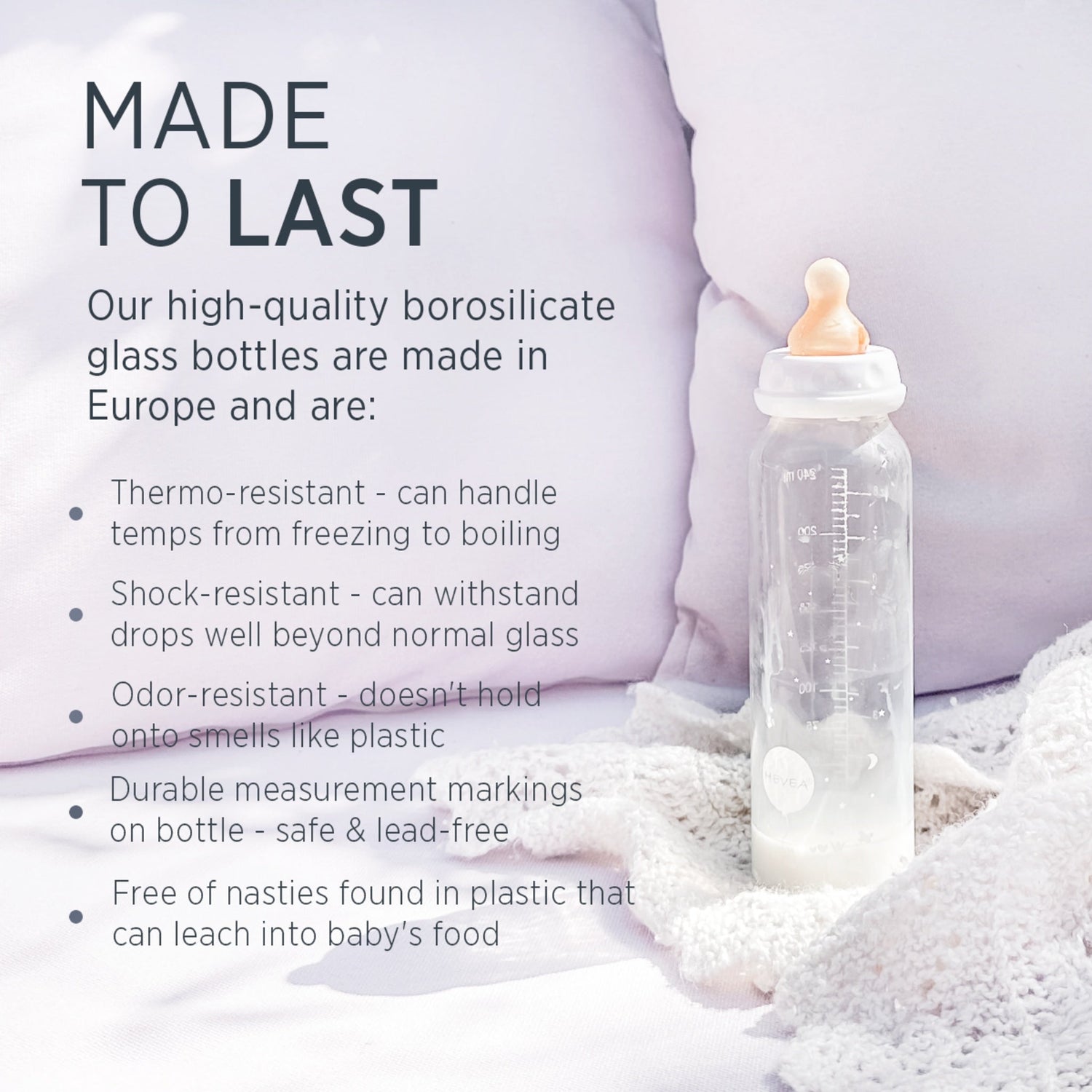 - TRUSTED BY PARENTS TO BE NATURAL AND SAFE – HEVEA baby glass bottles are made from the highest quality materials for your newborn baby! They are free of BPA, PVC, and Phthalates, and other harmful materials that can leach from plastic bottles. Our nipples are made from 100% natural rubber, and our bottle from shock and thermo-resistant borosilicate glass. Our screw thread and dust cap are made from non-toxic polypropylene